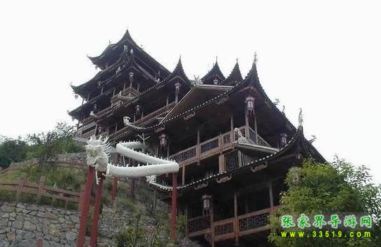 望郎峰北隔幽谷西望,一巨大石壁高聳云端,面寬達(dá)百米。因受風(fēng)雨剝蝕,流痕結(jié)網(wǎng),與頂端參差不齊的峰石結(jié)合,構(gòu)成錯(cuò)落有致的一幅壁畫:林木掩映的圍墻之內(nèi),池塘水榭,墻垣瓦梁,依稀可見。還有幾座吊腳樓,幾座寺廟,其間仿佛有人來往。雨天,云霧飄拂,樓臺(tái)墻垣若隱若現(xiàn),儼然海市蜃樓。