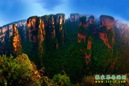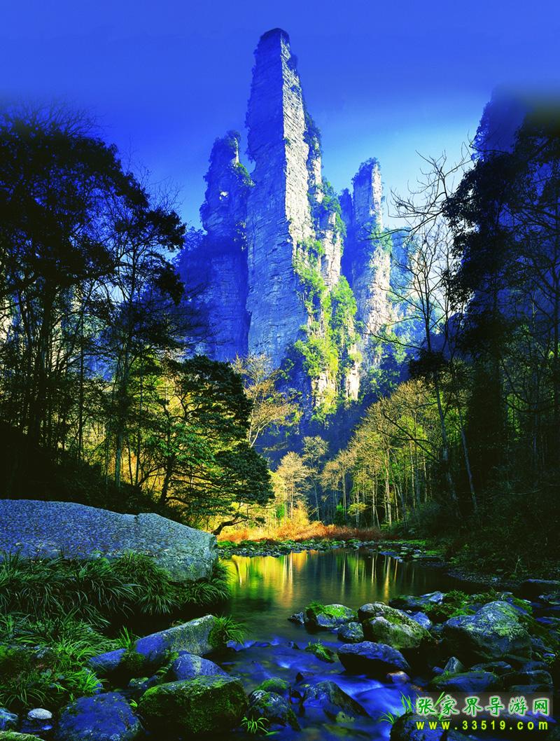 張家界國(guó)家森林公園位于湖南省西北部張家界市境內(nèi),是1982年由國(guó)務(wù)院委托國(guó)家計(jì)委批準(zhǔn)成立的中國(guó)第一個(gè)國(guó)家森林公園,1992年12月因奇特的石英砂巖大峰林被聯(lián)合國(guó)列入《世界自然遺產(chǎn)名錄》,2004年2月被列入世界地質(zhì)公園。公園自然風(fēng)光以峰稱奇、以谷顯幽、以林見秀。其間有奇峰3000多座,這些石峰如人如獸、如器如物,形象逼真,氣勢(shì)壯觀。峰間峽谷,溪流潺潺,濃蔭蔽日。有“三千奇峰,八百秀水”之美稱。公園不僅自然風(fēng)光壯美絕倫,而且森林植物和野生動(dòng)物資源極為豐富,森林覆蓋率達(dá)98%,是一座巨大的生物寶庫(kù)和天然氧吧,被稱為“自然博物館和天然植物園”。草木禽獸與奇山異水,同生共榮,形成完美的自然生態(tài)系統(tǒng)。