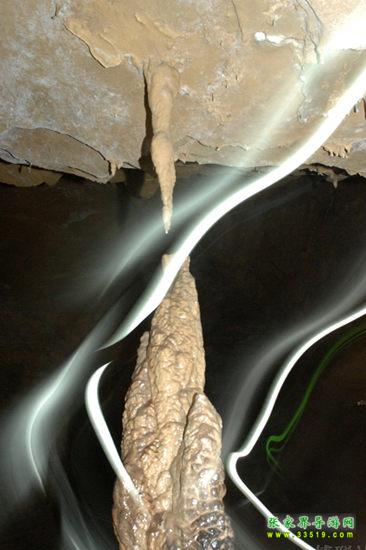 在這兒向您介紹一點溶洞學的知識。在溶洞中,自洞頂往下生長的叫石鐘乳,自洞底往上生長的叫石筍,兩者相向生長連在一起就叫石柱,三者統(tǒng)稱為鐘乳石。這兒有一根石鐘乳與一根石筍是相對生長的,差一點點就要連起來了,但他們卻永遠不能合在一起,因為上面的石鐘乳已經沒有滴水,已經失去了生命力。這好像一對苦苦守望的情人,近在咫尺,卻永遠不能相逢。于是人們便給他們取了一個非常動人的名字——恨難逢。“盈盈一水間,脈脈不得語。”“天涯海角有窮時,只有相思無盡處。”在無數個春去秋來的日子里,他們該有多少離愁別緒啊!——真不知道是石頭多情,還是人多情?——而有的人說得很樂觀,“兩情若是長久時,又豈在朝朝暮暮”,所謂“距離產生美”嘛。