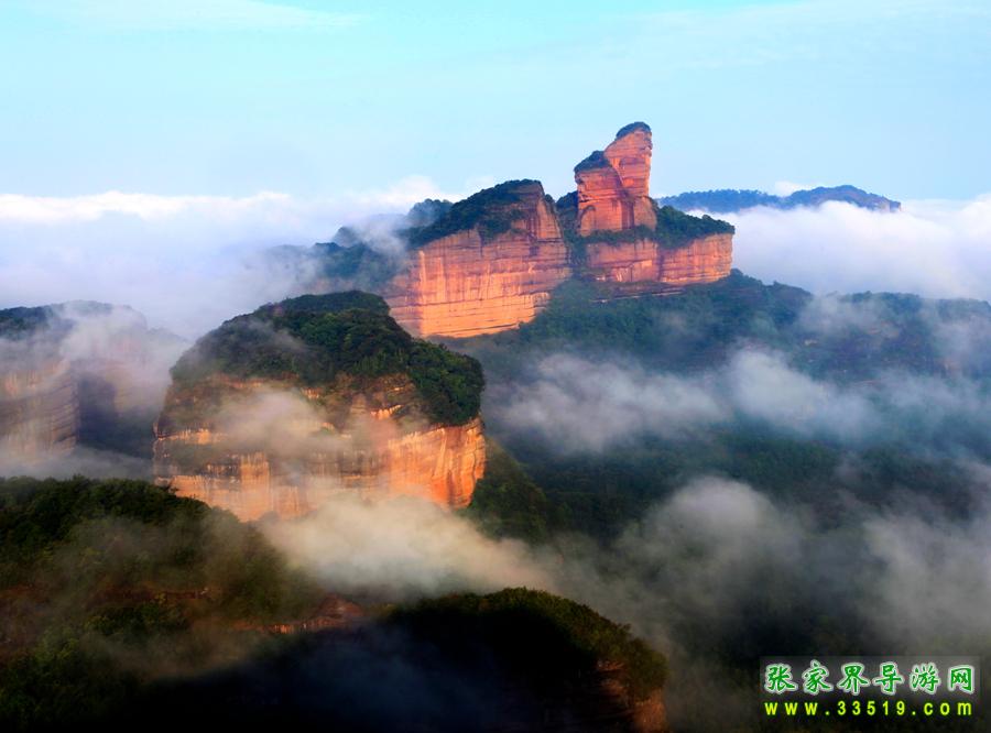 由步步高西去數(shù)百米,抵達(dá)“神龜鬧海”景點。憑欄俯視,壁陡谷深,左側(cè)一峰柱頂端不齊,高低處各有一石如龜匍伏。高處之龜體大如盆,仰頭西望,背上有紋理似八卦,其尾高翹,似在爬行。左下一龜較小,似藏頭露尾,畏縮不前。東南50多米處,一堵絕壁的南緣腰間,連接著一塊高大的斷石,斷面上又有一石如龜,翹頭藏尾,似臥沙中。石龜之間有幾根筆立高聳的石柱,石柱周圍是空蕩深邃的山谷。云霧變幻時,山峰時隱時現(xiàn),石龜漂浮游弋,靈詭異常。