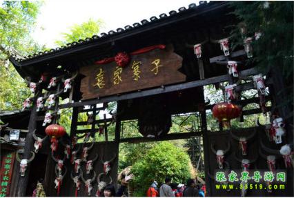 土家族建筑的特色,寨門(mén)檐角向上翹起,中間橫著“