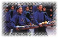 指著圓符,不久,蒙面者便神魂入定;似有神附體,慢慢地全身抖動起來,手舞足蹈,這就是已“進(jìn)入陰間”。據(jù)傳過陰之人,雖蒙頭蓋面,也能辨別方向,隨法師的指使行事,陰間之事能有問必答,人們所要了解之事,也都從他們那里得到答復(fù),并可以探求禳解之法。法師用法術(shù)指使他們?nèi)プ龈鳂邮虑?。到一定時間,法師用咒語報他們招回,他們在法師的指示下,陸續(xù)返回陽世清醒過來。若有個別不能返回,法師則加倍對他們施法,用刀指向他,并念咒畫符,強令返回。過陰之人蘇醒后,法師揭開頭蓋,這時個個面色慘白,目光遲鈍,如害一場大病。法師再施以復(fù)原之術(shù),使之慢慢復(fù)原。他們復(fù)原后,完全忘記陰間的事情。