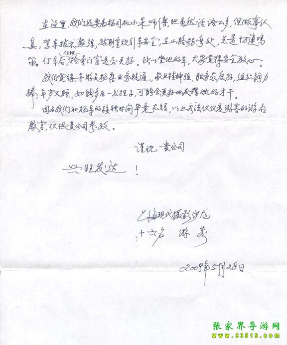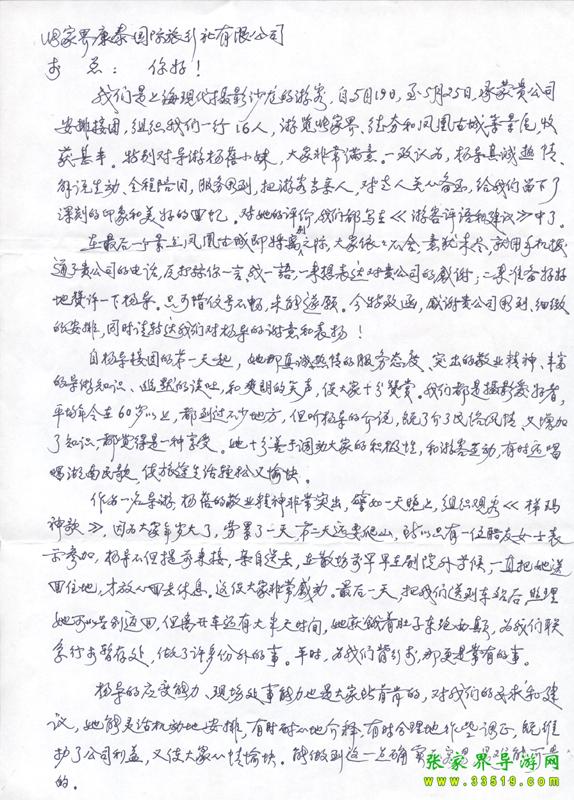 2009年5月19日“上海現(xiàn)代攝影沙龍”一行16人,參加張家界旅游導(dǎo)游網(wǎng)組織的張家界旅游跟團(tuán),于2009年5月25日結(jié)束行程。游玩期間,由于導(dǎo)游楊蓓的出色講解和周到的服務(wù),得到客人的一致好評。客人特寄表揚信一封,如下: