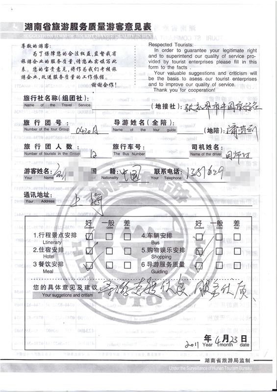 2011年4月23日劉先生旅游質(zhì)量反饋:導(dǎo)游態(tài)度優(yōu)良,服務(wù)優(yōu)質(zhì)