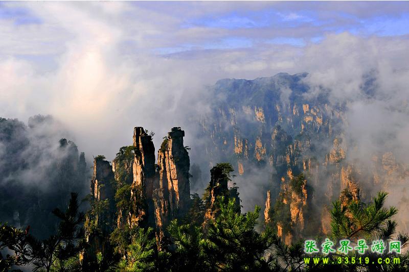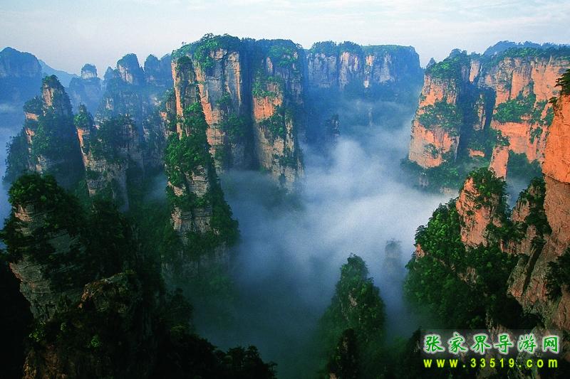 第二天早上,我們參觀了袁家界的風(fēng)景,其中最有名的當(dāng)然數(shù)天下第一橋,這是由兩座巖石山的山頂自然生長(zhǎng)在一起,非人所能為也。天下第一橋的稱(chēng)號(hào)當(dāng)之無(wú)愧啊。當(dāng)然在袁家界,后花園也是不能不看的。張家界號(hào)稱(chēng)“峰三千,水八百”,在這里你就能明顯的感覺(jué)到這句話(huà)的前半句是那么的實(shí)在??赐?a class="insidelink" href="http://m.shengyuwood.com/" title="張家界">張家界的核心袁家界,我們乘車(chē)到了天子山(張家界景區(qū)內(nèi)的最高的地方)。玩了賀龍公園、御筆峰、仙女散花、西海、石船出海、仙人橋、天子廟、十里畫(huà)廊、一步難行。不巧的是,那天山上下了一點(diǎn)陣雨,雨后一條彩虹掛在天上,更重要的是山上起了一點(diǎn)霧,使整座山都籠罩在霧中,若隱若現(xiàn),看上去就象是在云海中,好象老天特地配合我們似的,難得一見(jiàn)的西海等正好被我們趕上了。江導(dǎo)告訴我們,這樣的機(jī)會(huì)是很難得的,可能是張家界為了感謝我的再次到來(lái),給了我一個(gè)特別的禮物吧。我大笑。晚上趕到昨天住的地方去住宿。不提。